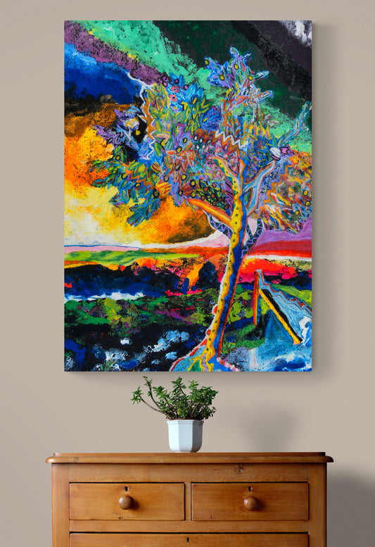 Brightly coloured and vivid landscapes rendered in textured acrylic paint from the...