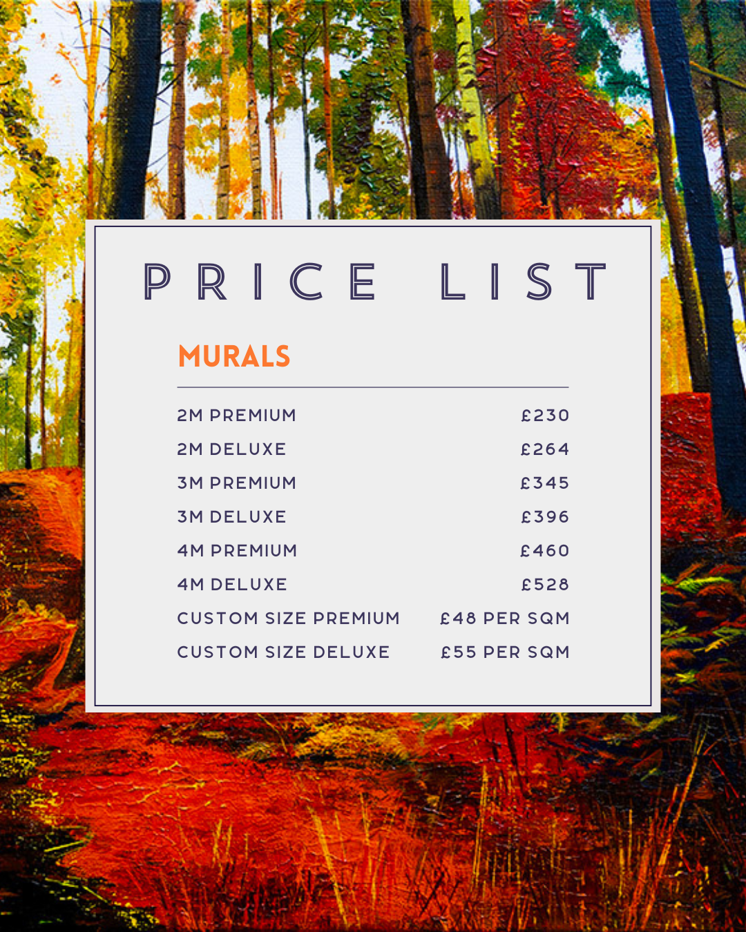 If you require a completely custom-sized wallpaper mural, complete the form below and I will contact you with your personalised invoice for your chosen artwork. Prices are fixed per square metre so there are no hidden costs.